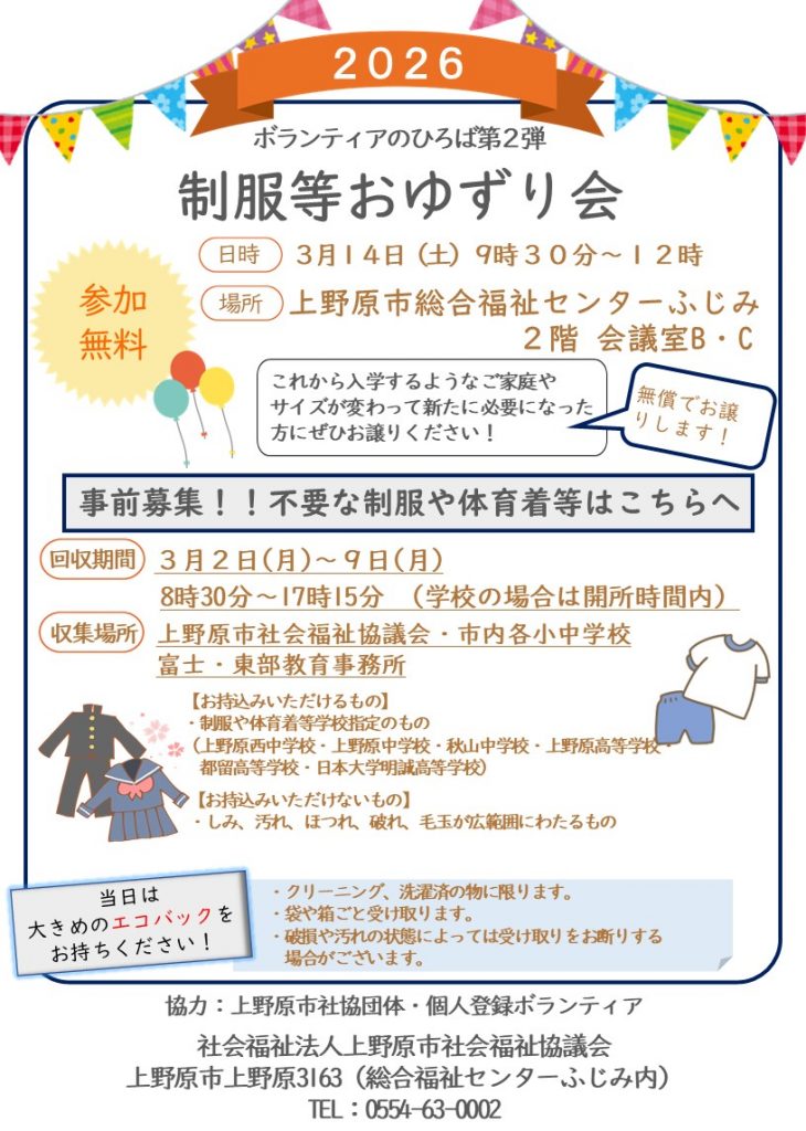 社会福祉協議会では3月14日(土)に市内のボランティア団体協力のもとボランティアのひろば第2弾、制服等おゆずり会を実施します。当日はエコバッグの持参をお願いします。
