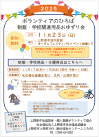 社会福祉協議会では11月23日(日)開催の第3回うえのはらオータムフェスティバルにて市内のボランティア団体協力のもとボランティアのひろばを出展し、制服・学校関連用品・介護用品おゆずり会を実施します。当日はエコバッグの持参をお願いします。